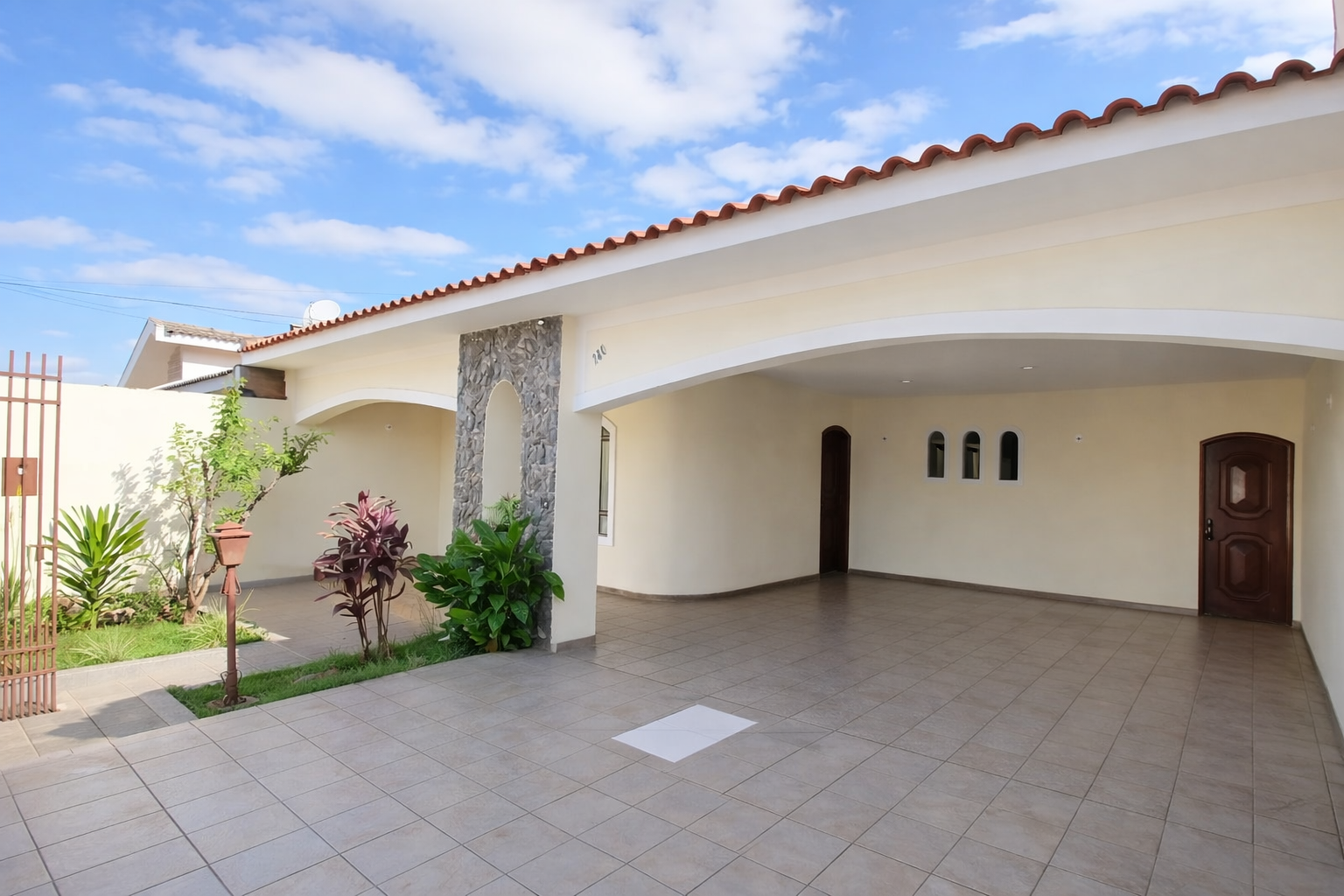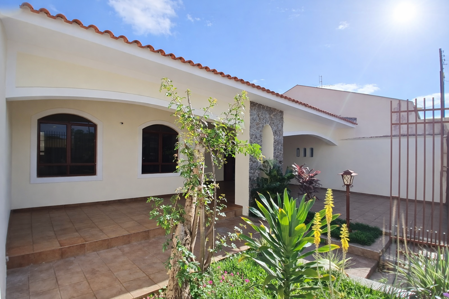 Garagem para 4 vagas (2 cobertas e 2 descobertas), jardim, varanda, sala de estar, sala de jantar, cozinha com armários planejados, sala de TV, lavabo, banheiro social, 2 quartos, 1 suíte com móveis planejados, área gourmet com churrasqueira, lavanderia, quarto e banheiro externo e dois corredores laterais.Características