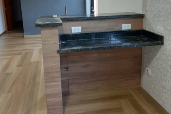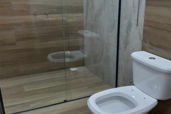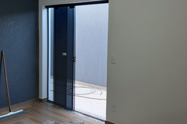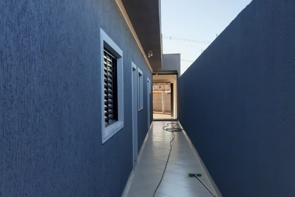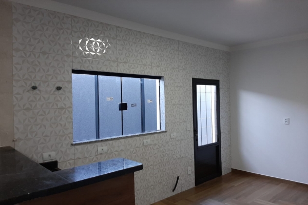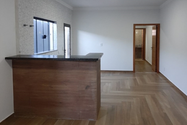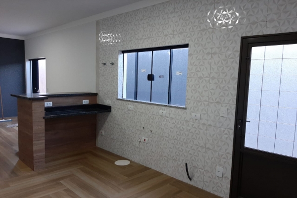 1 suíte, 1 quarto, sala, cozinha, balcão de granito preto São Rafael, banheiro, box de vidro, lavatório de granito, garagem para 2 carros. Construção de laje com acabamento em gesso, piso todo em porcelanato. Área do Terreno: 125m² - Área Construída: 100m²